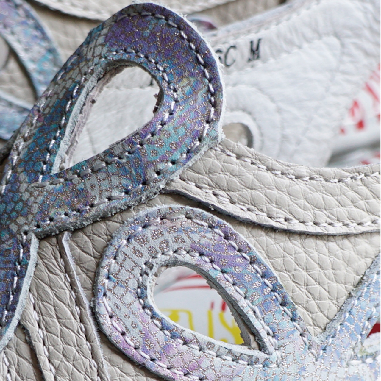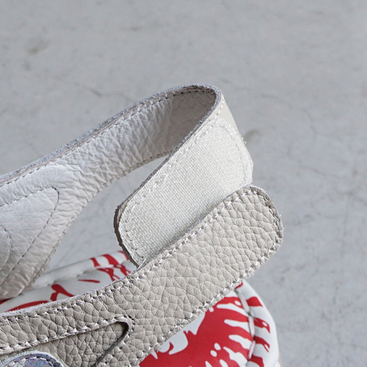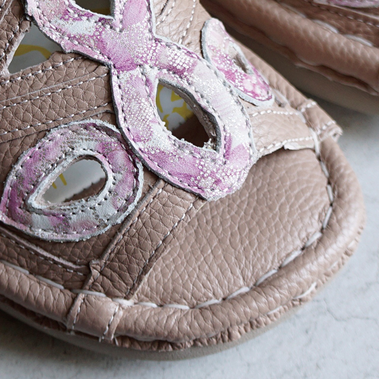 本革パーツを1本1本丁寧に重ね合わせたデザインで、おしゃれな足元を演出してくれます。