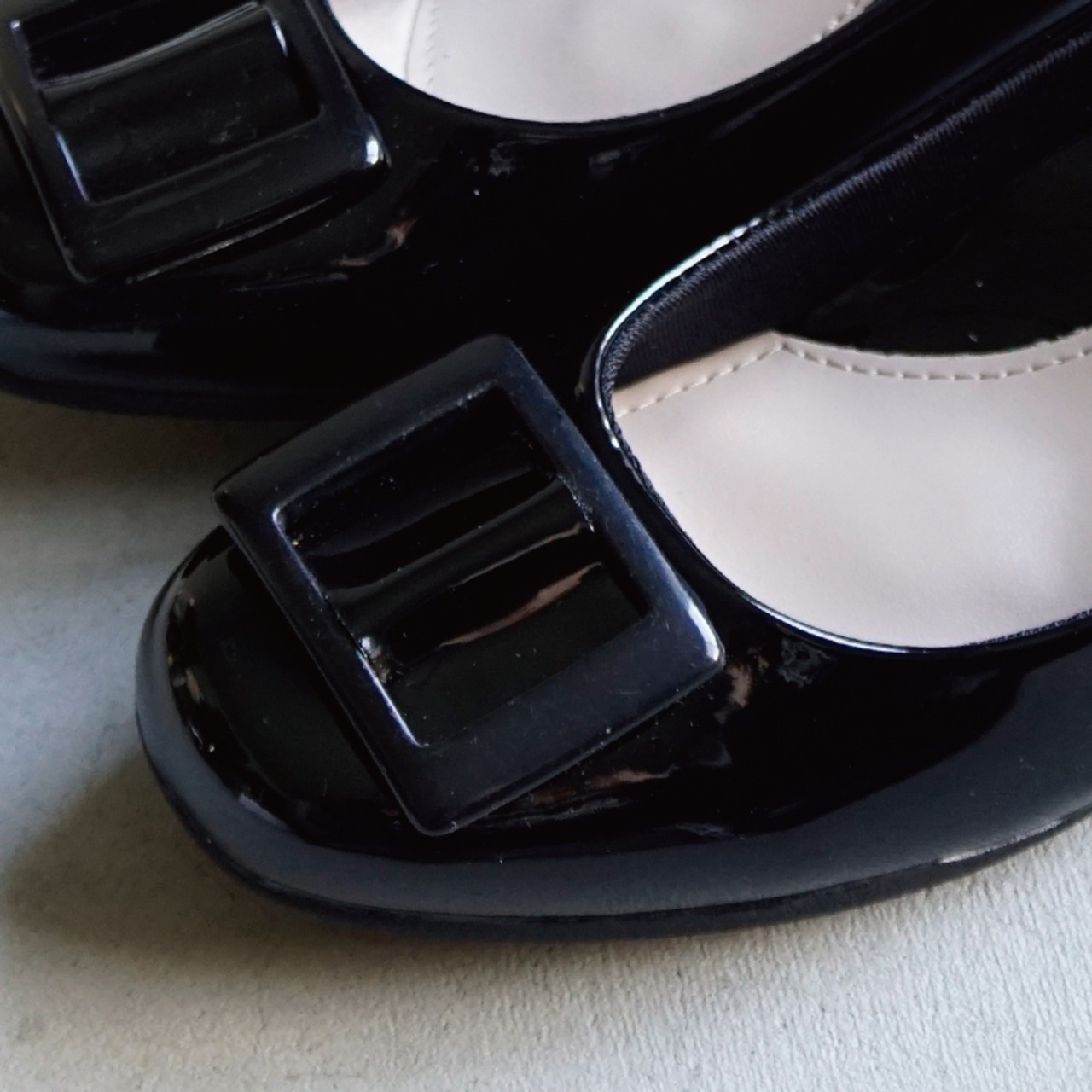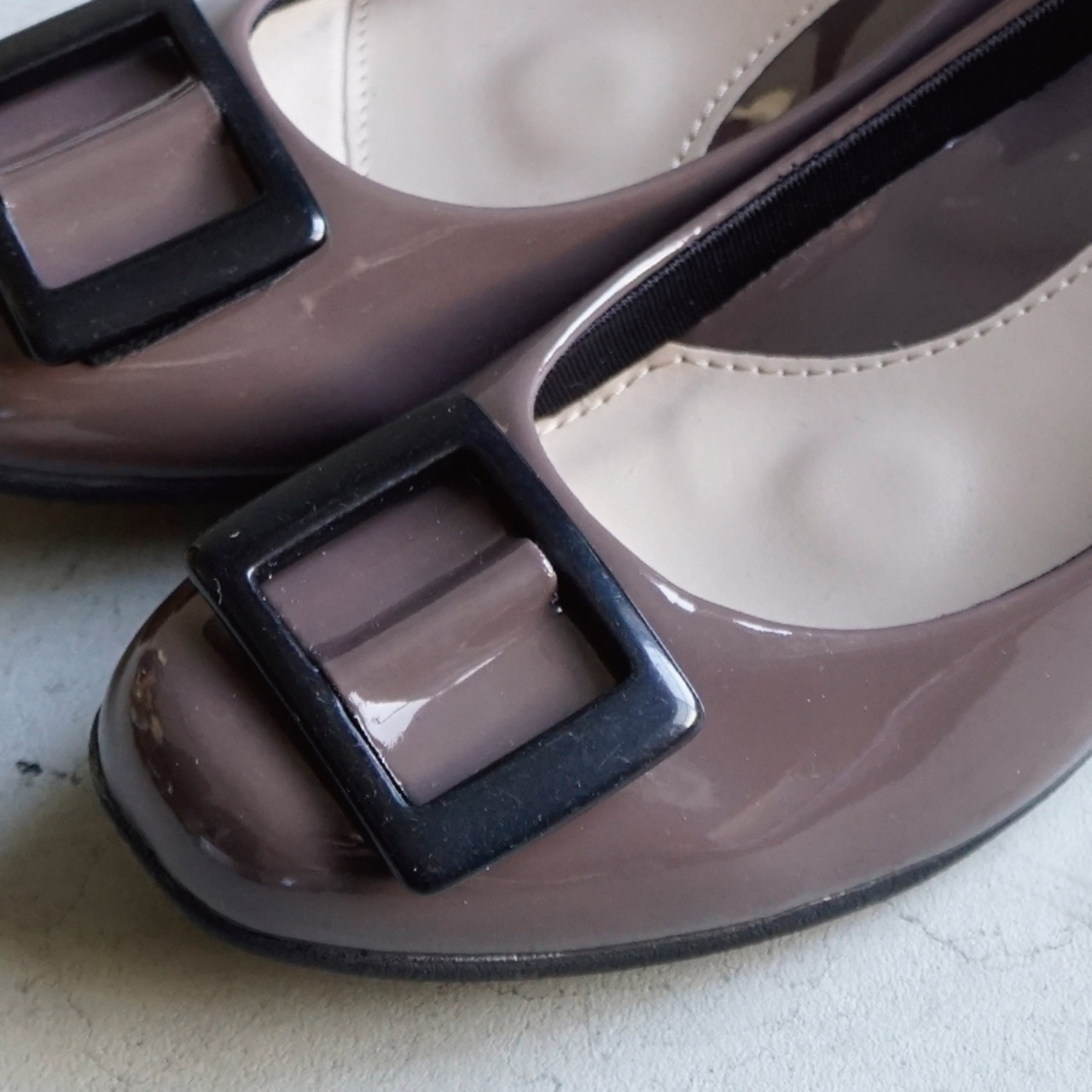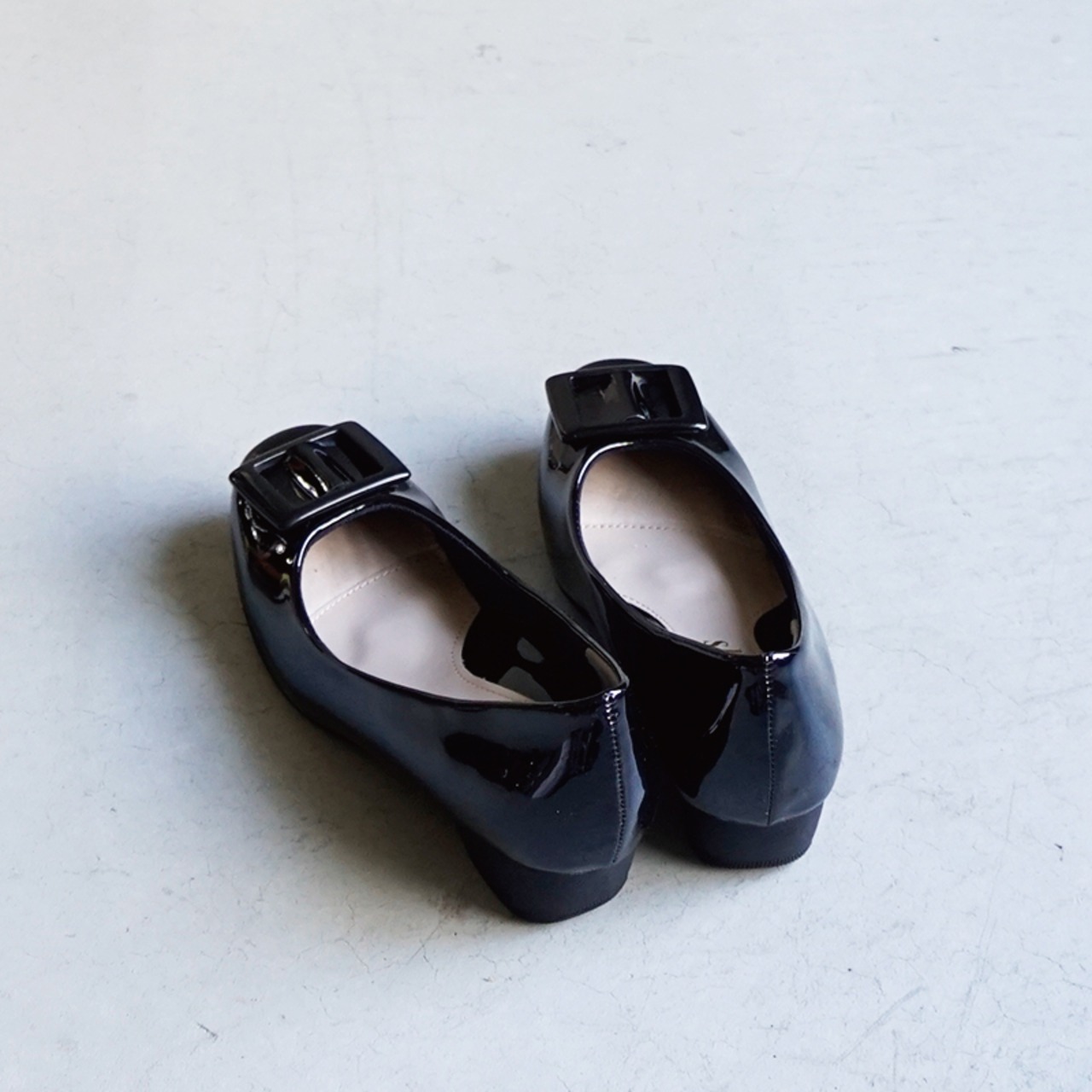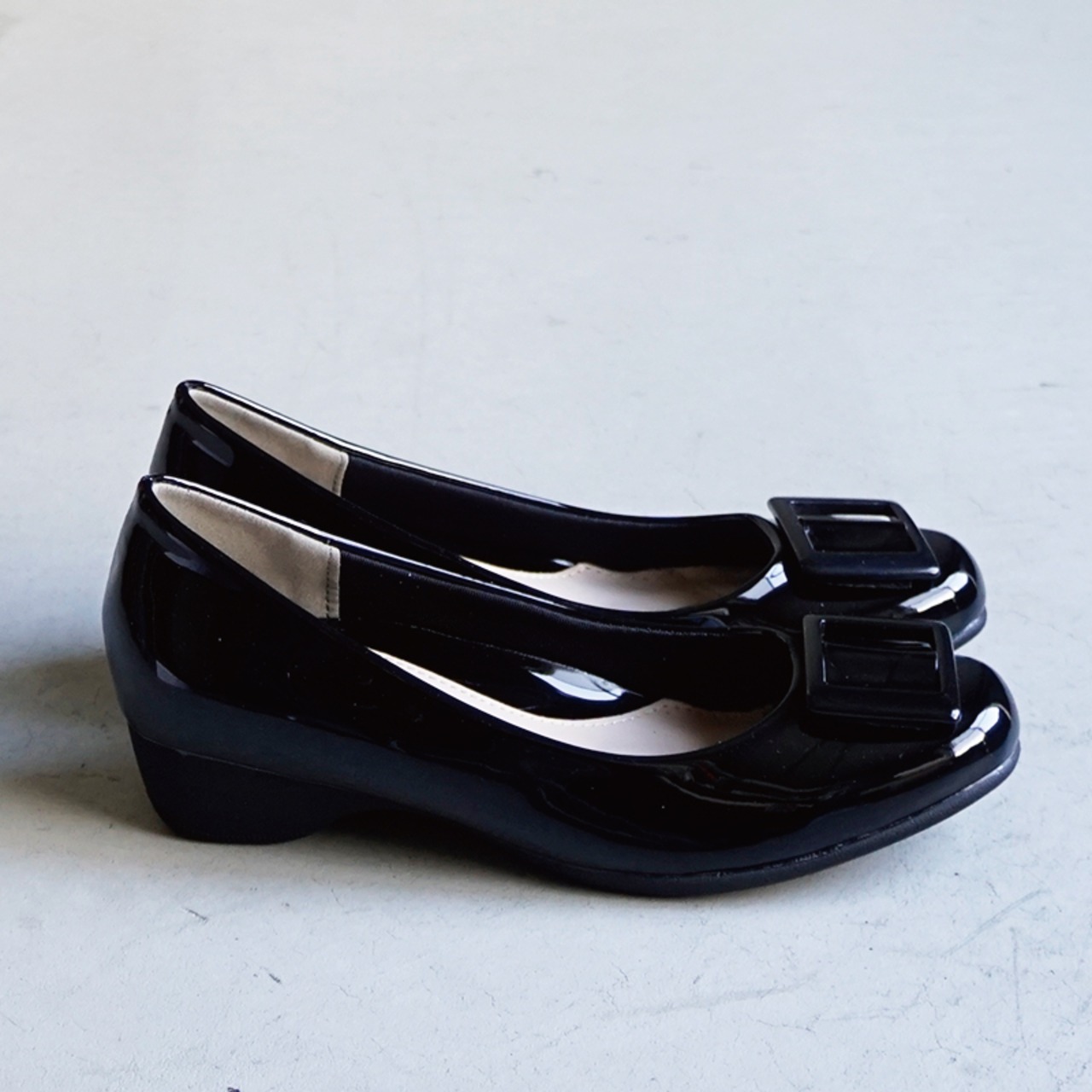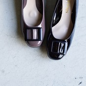上品な艶感が美しいエナメル素材に、存在感のあるスクエアバックルをあしらったデザインが魅力的。