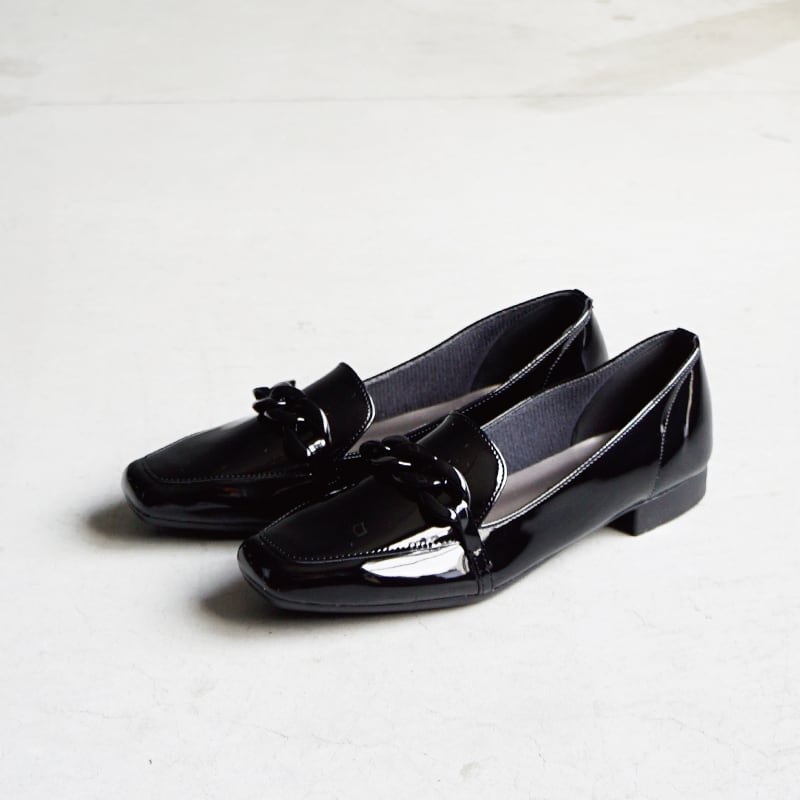 大人の雰囲気漂うスクエアトゥのエナメルローファーパンプス。