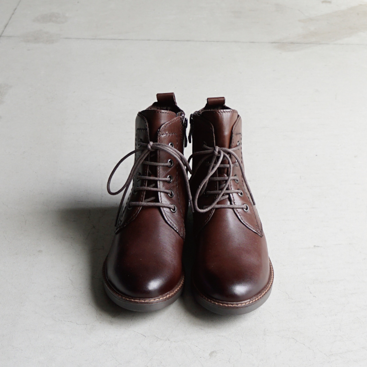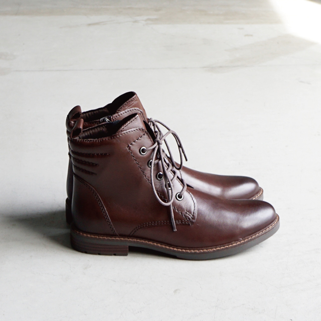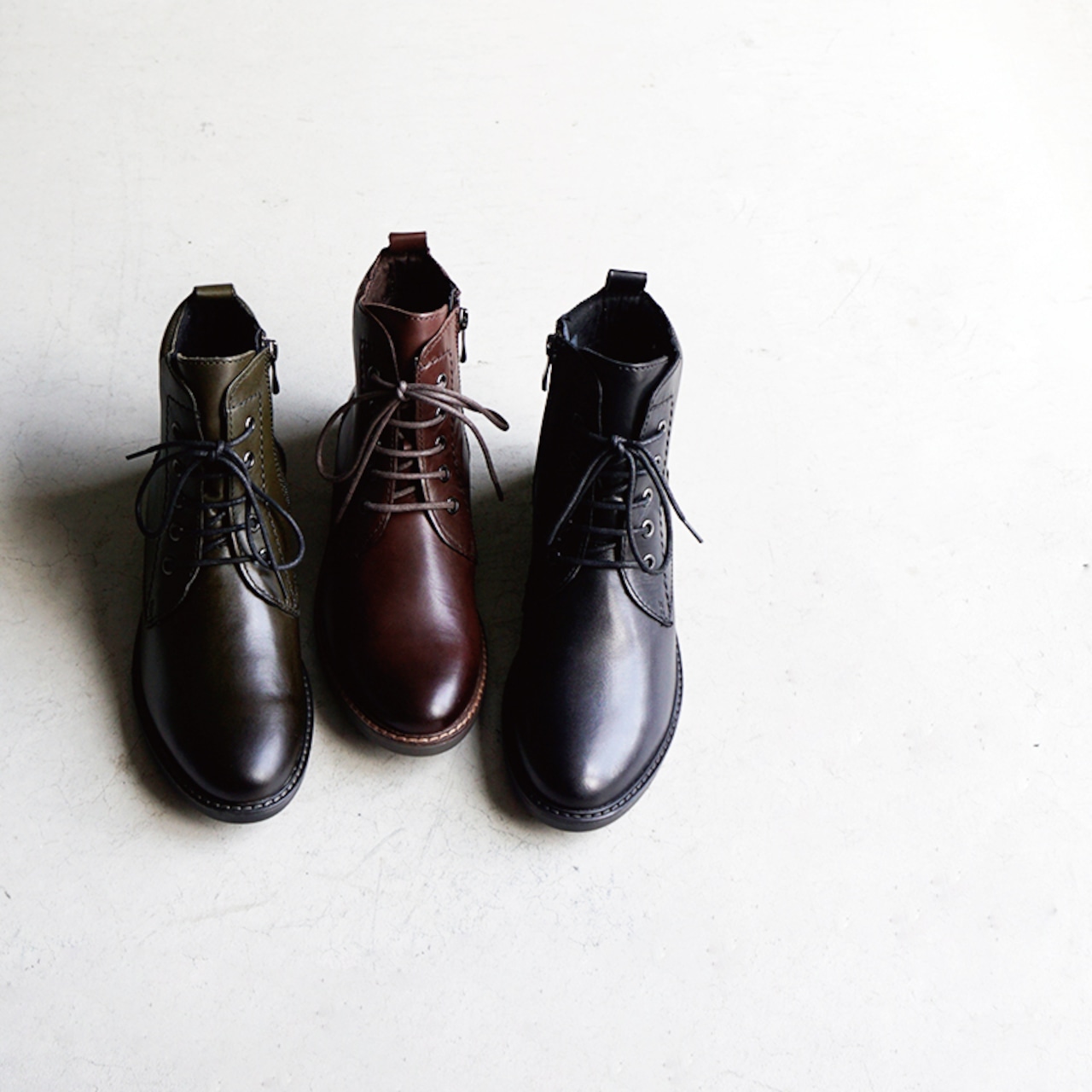 すっきりとしたシルエットと落ち着いたカラーが魅力のレースアップブーツ。