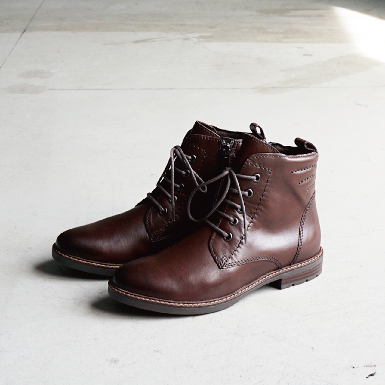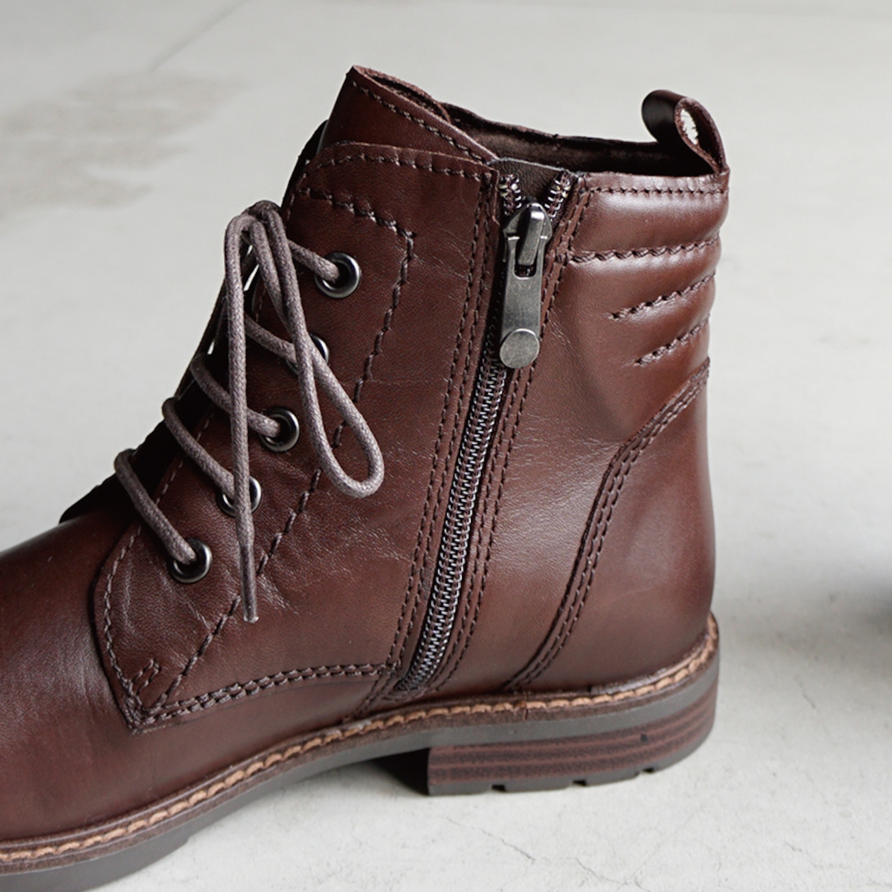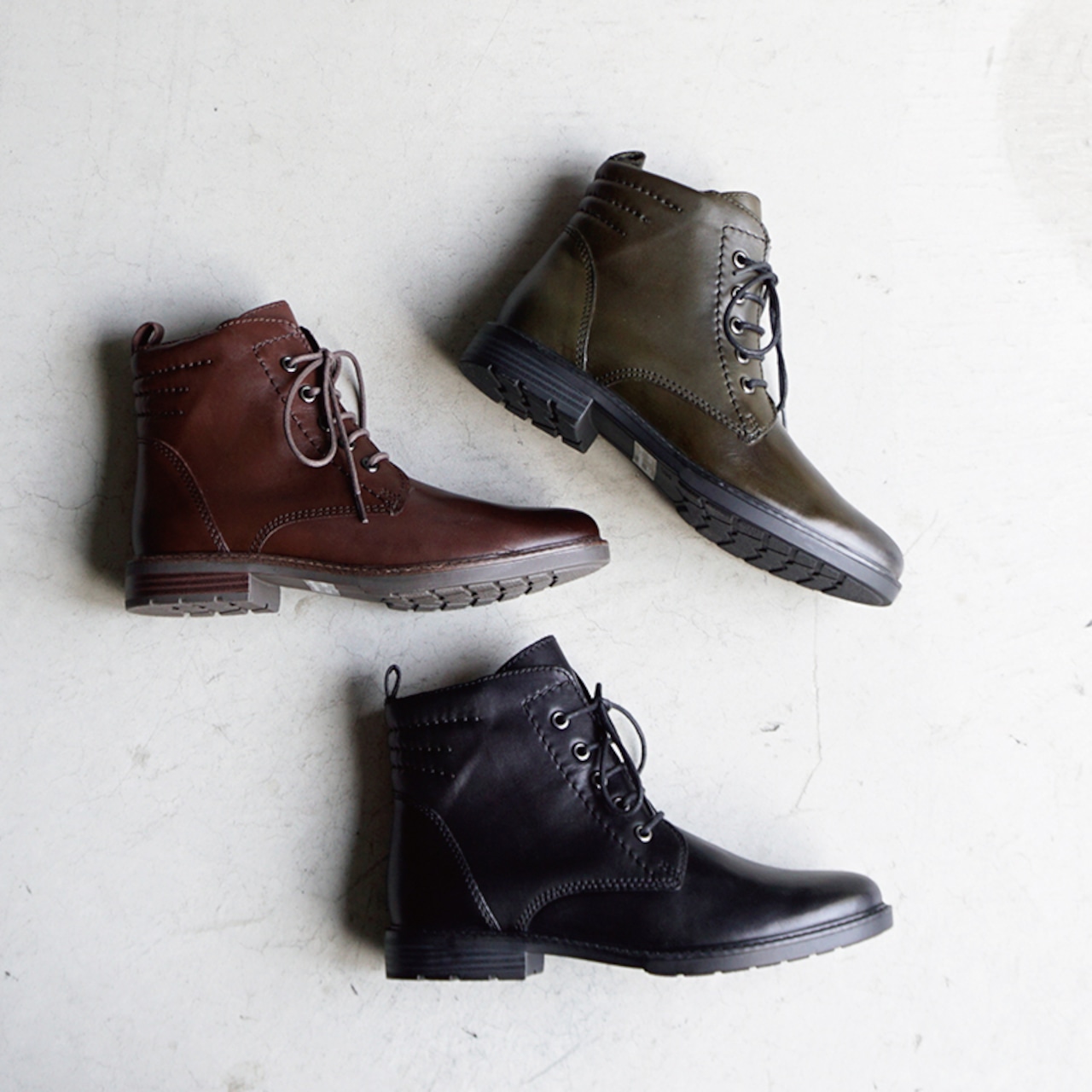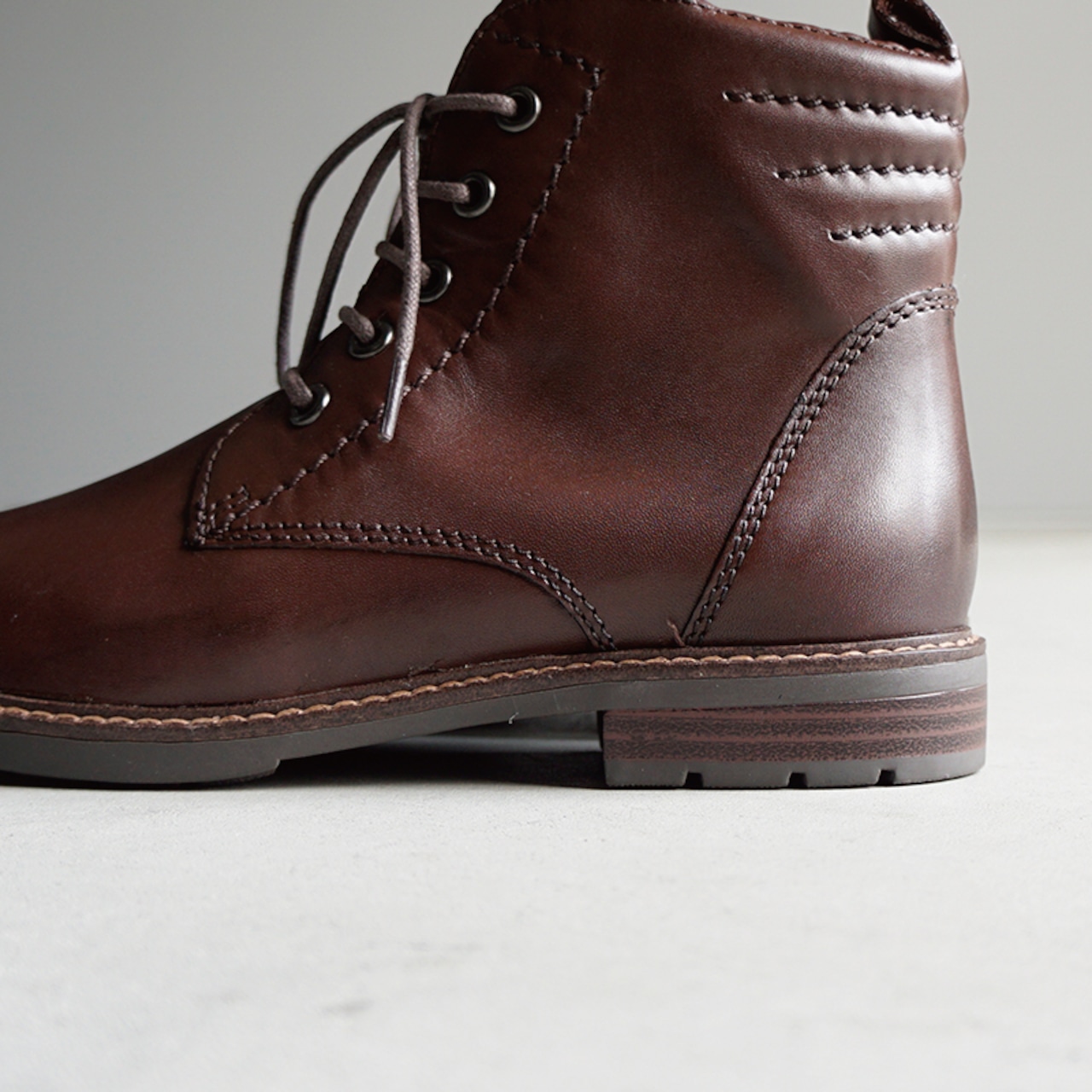 すっきりとしたシルエットと落ち着いたカラーが魅力のレースアップブーツ。