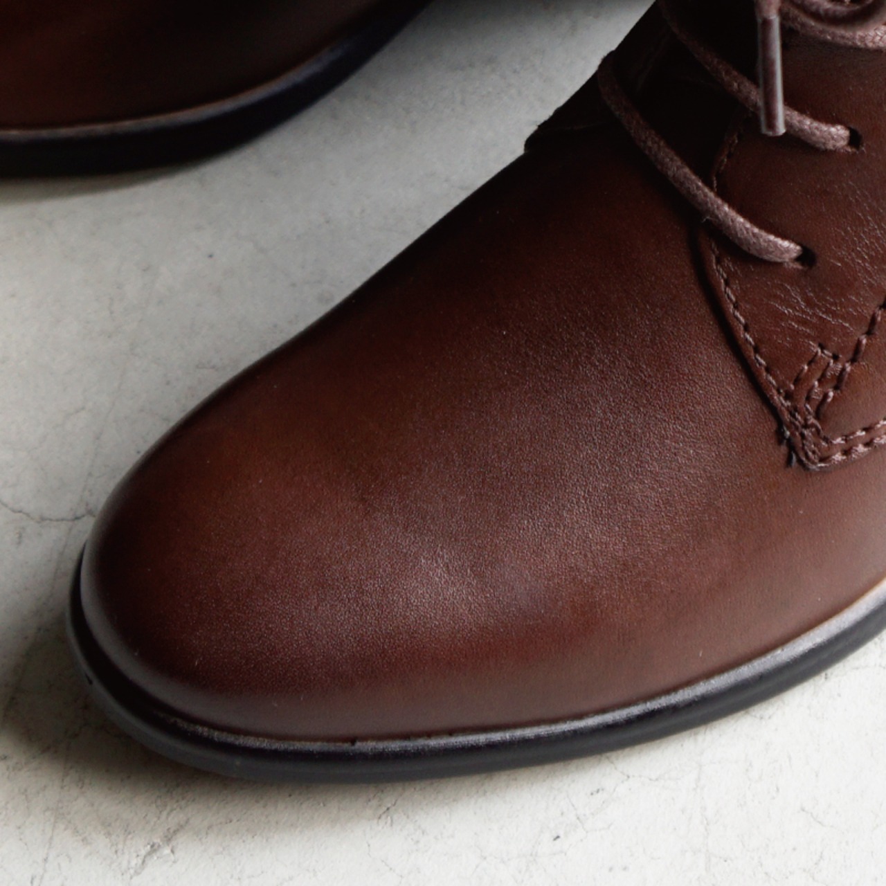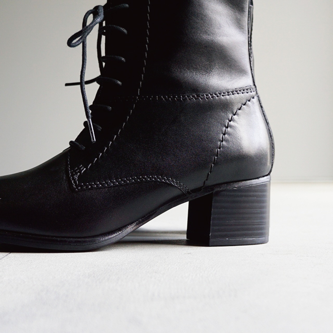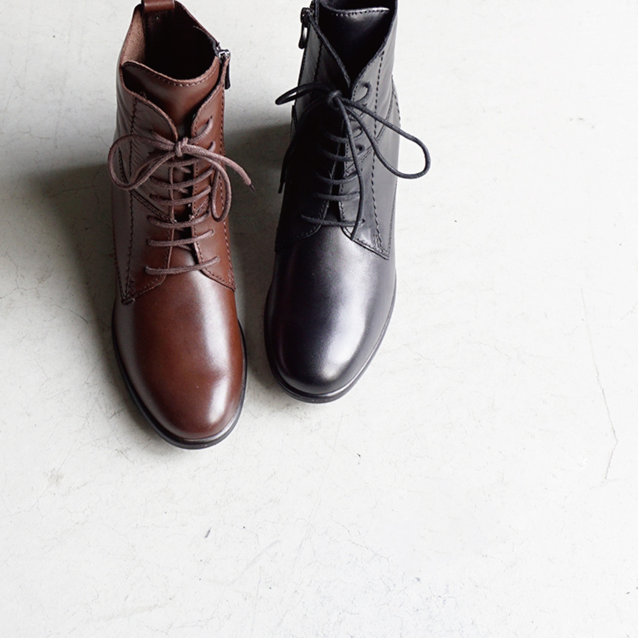すっきりとしたシルエットと落ち着いたカラーが魅力のレースアップブーツ。