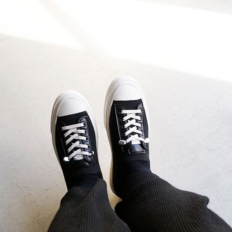 シューレースはゴム仕様のため結ぶ手間がなく、スムーズな脱ぎ履きが可能です。