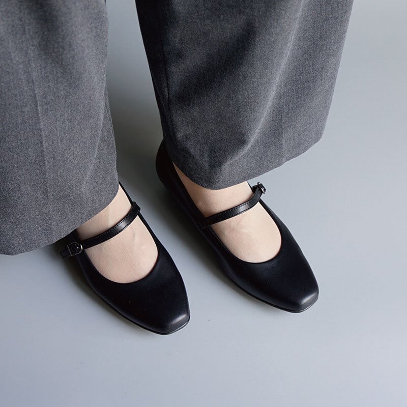 すっきりとしたスクエアトゥに、華奢なストラップを添えた上品なパンプス。